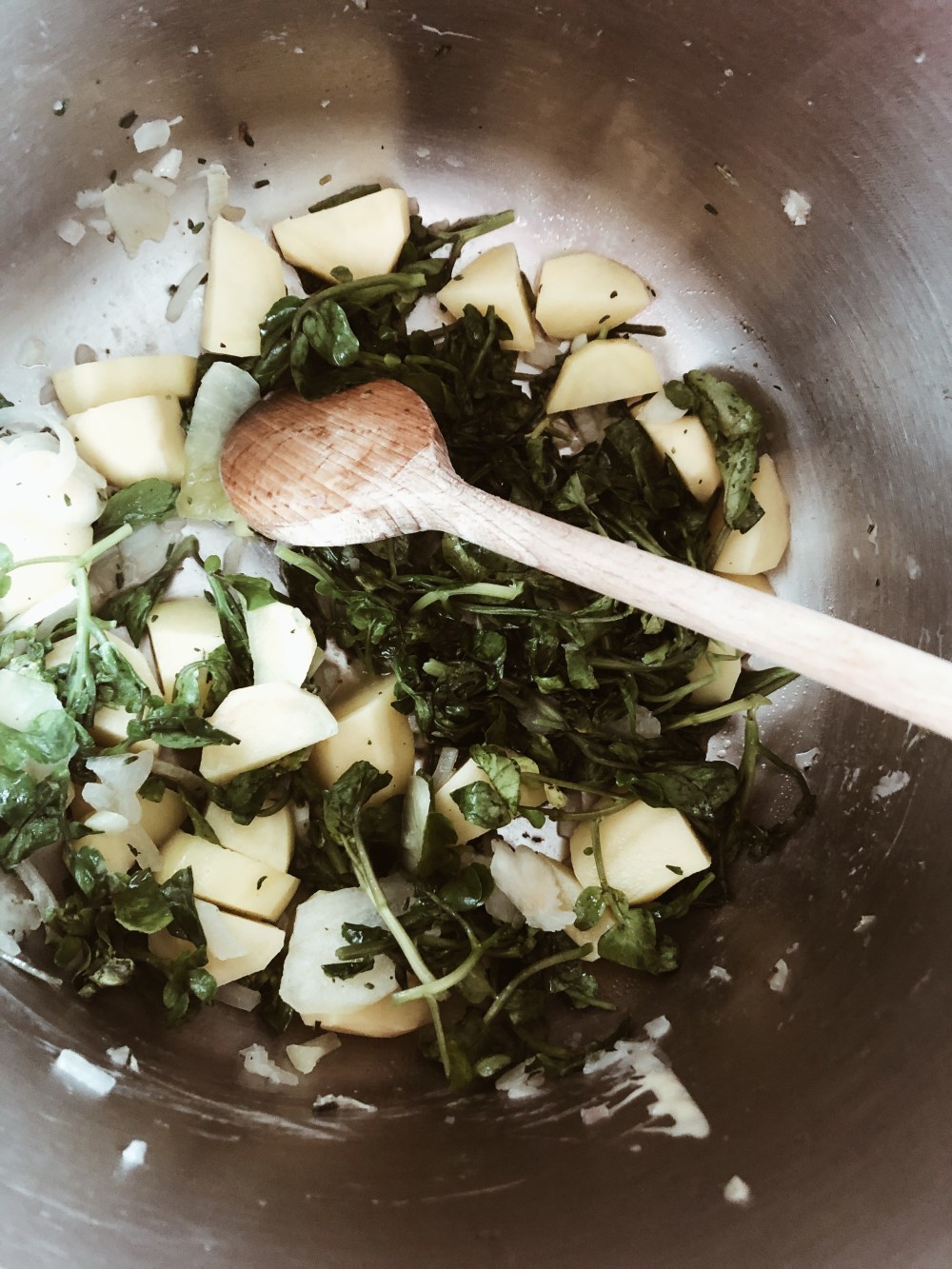 - Mettez le beurre à chauffer dans une cocotte minute (ou une grosse casserole), puis ajoutez le cresson, les morceaux de pommes de terre, l’échalote hachée et le thym.