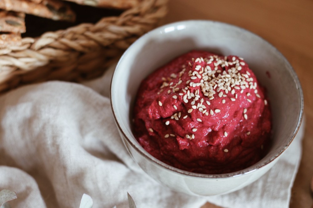 Envie d’un apéro végétarien? La crème de betterave est parfaite pour l’occasion. À déguster sur des crackers aux graines de sésame et courge.