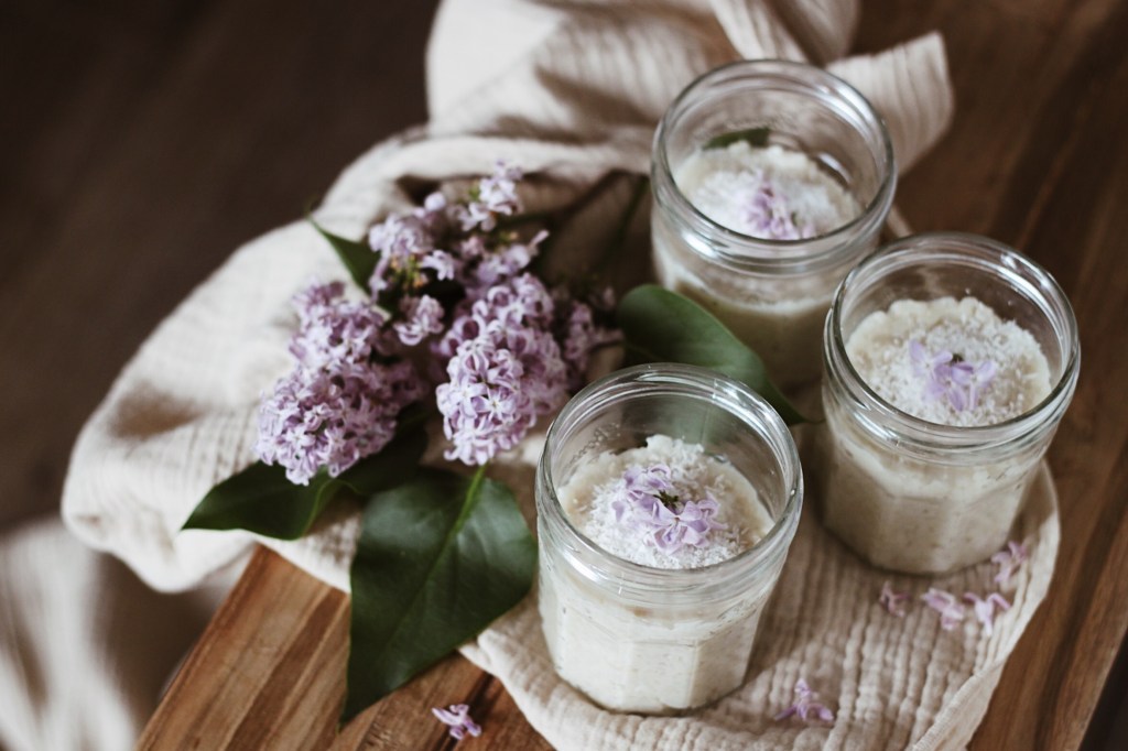 - Versez dans les pots, saupoudrez de coco râpée & ajoutez quelques fleurs de lilas pour décorer uniquement.
