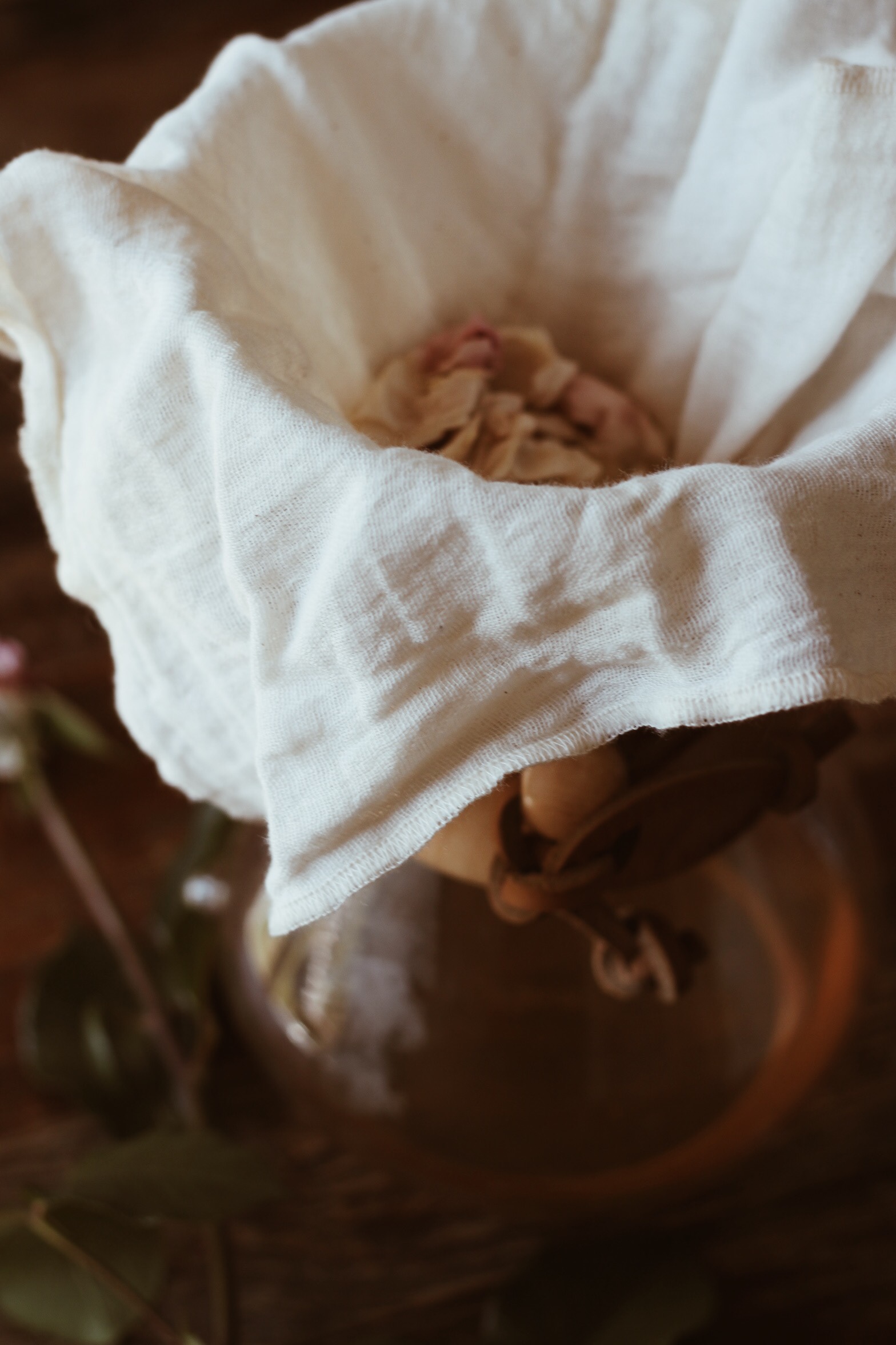 *Filtrez votre eau grâce à un lange en coton organique. J’utilise toujours le même, les pétales peuvent tâcher le tissu.