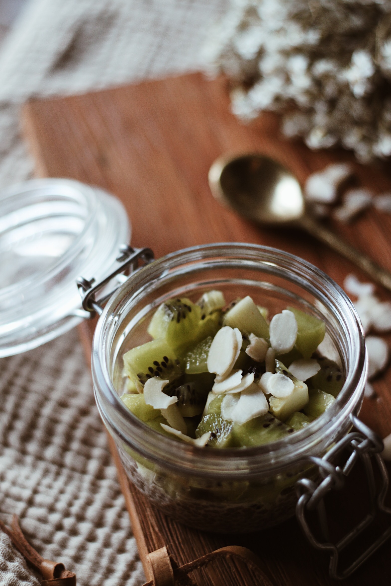 - Découpez en petits morceaux le kiwi et disposez-les au-dessus du mélange au chia.