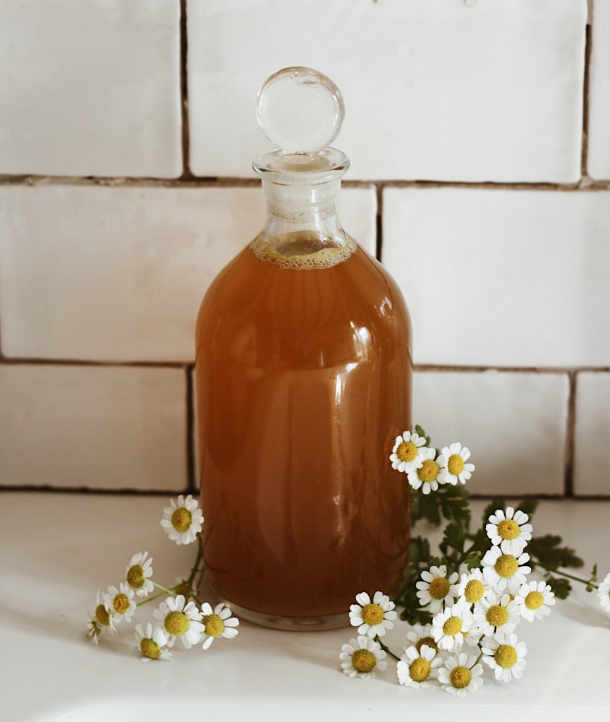 Pour réaliser cette eau de rinçage, on peut soit laisser infuser les fleurs de camomille séchées ou bien préparer une décoction. Si vous n’avez pas de fleurs séchées, vous pouvez aussi utiliser des sachets de tisane à la camomille.