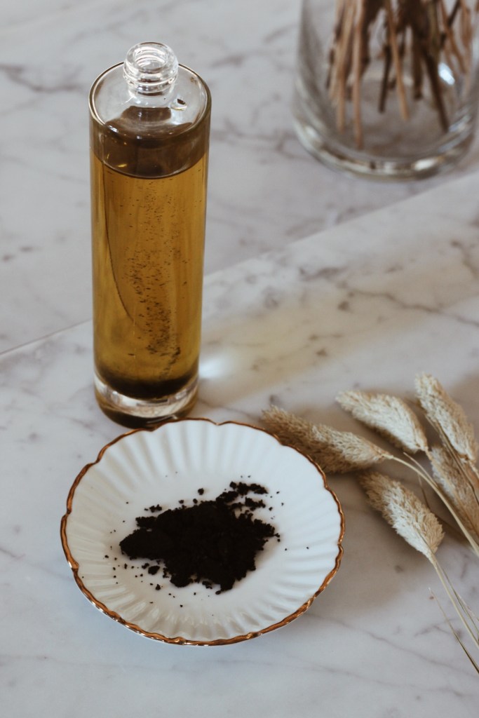 - Après le temps de pause, filtrez votre huile à l’aide d’un tissu en coton. Je filtre en règle générale deux fois le mélange, pour retirer le maximum de dépôt de poudre fine.