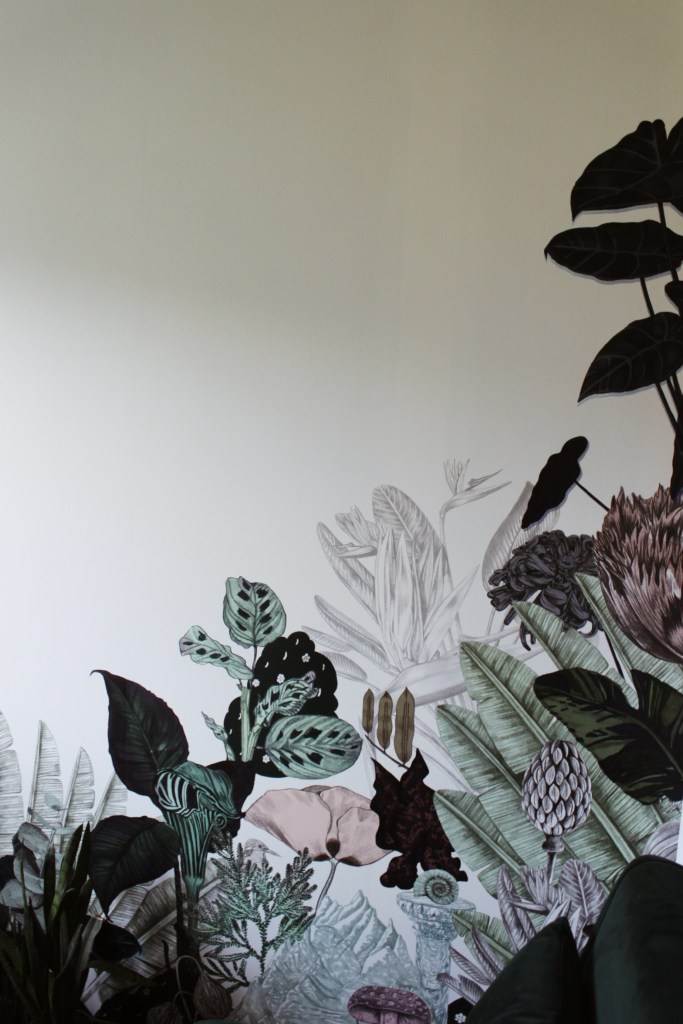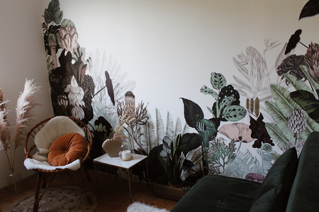 La nature se dessine sur l’un des murs de notre nouvelle chambre d’amis, une forêt en a pris possession. De grands arbres et plantes, un papier peint Photowall référence « Paradise Lost » qui nous comble de joie de part sa beauté et sa qualité. Nous avions envie d’une belle pièce verte et nous sommes enthousiasmés par le résultat. Ce mur de papier peint fait face à un mur fraîchement peint, coloris vert sapin. Pour la décoration, on a opté pour des nuances de doré et des pièces en bois et rotin, ainsi qu’un canapé convertible en velours vert sapin lui aussi. Une belle harmonie!